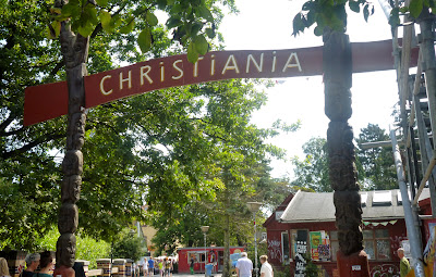 Christiania is a self-declared 'free state' within Copenhagen, mostly famous for openly selling drugs. We were just curious to see it but only stayed for about ten minutes as it felt a bit paranoid and sinister. There were a great many signs everywhere forbidding photography, and I don't suppose the drugs on sale are any freer from dodginess and misery up the supply-chain than anywhere else. It's pretty amazing (to us from the uptight UK) that such an enclave is tolerated, but perhaps the city think it somehow practical to corral the hippies and dopedealers there -- not all of them, obviously, but a fair number -- and practise a kind of vigilant tolerance. I think there are signs that the authorities may try to close it down at some time in the not too distant future. A great set of photos from inside Christiania by Maja Daniels here.